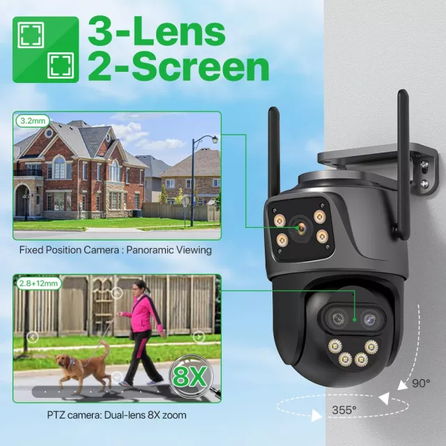 Keep your home or business safe with this advanced 6K 9MP HD outdoor WiFi camera. Designed with three lenses and dual-screen monitoring, it gives you both a wide-angle view and a long-distance close-up at the same time. With 360° pan, tilt, and zoom control, you can monitor every corner with ease from your smartphone. Whether you need to protect your front yard, driveway, or business property, this camera is built for around-the-clock security.