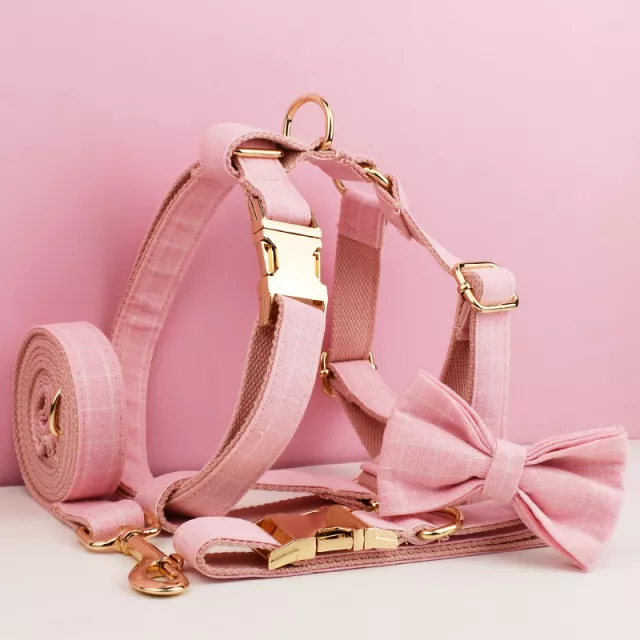 Dress your pup in timeless elegance with this Pink Plaid Dog Collar, Harness, and Leash Set. Designed with a soft yet durable fabric, this set combines cuteness with practicality, ensuring your furry friend looks adorable while staying safe and comfortable on every walk. The matching plaid bow adds a touch of charm that will make your dog stand out wherever you go.
