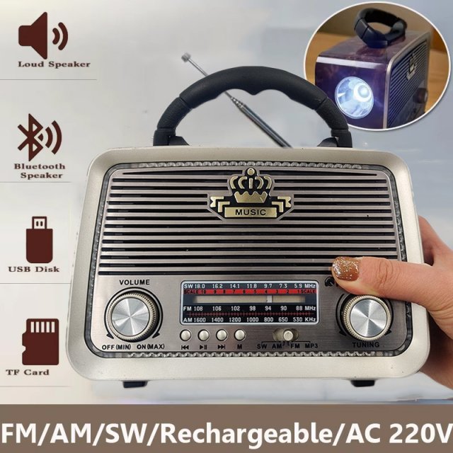 • All-in-One Functionality: Radio receiver, Bluetooth speaker, USB/TF card player, AUX input, and flashlight in one portable design.