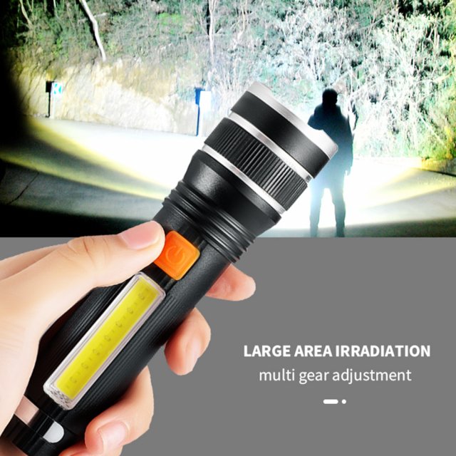 Whether you’re camping, hiking, or preparing for emergencies, this flashlight is a versatile companion. Its telescopic zoom lets you switch between wide-area lighting and focused beams, while the side COB lights provide extra illumination when you need hands-free lighting or emergency signals. Featuring four light modes, including strong white light, soft white light, red flash, and white flash, it adapts to any situation with ease.