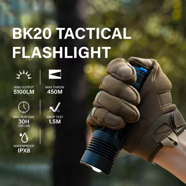 Crafted from aerospace-grade aluminum with a hard-anodized anti-wear finish, this flashlight is built to handle tough environments. Its IPX8 waterproof rating and 1.5 m drop resistance ensure reliable performance in rain, snow, or rugged terrain. Plus, the stainless steel attack head with ultra-hard ceramic beads doubles as a window-breaking tool for emergencies.