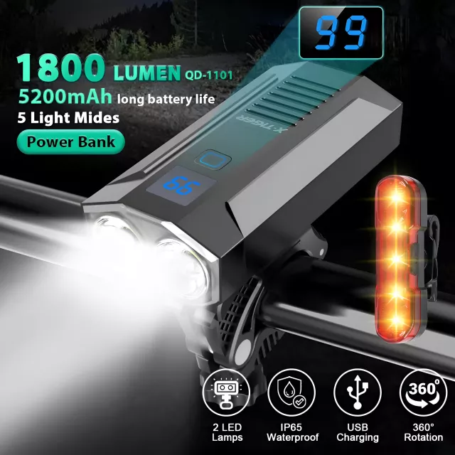This advanced bike lighting set combines powerful brightness, long-lasting battery life, and smart design to give you peace of mind during every journey. The headlight features multiple modes for flexible visibility—switch easily between 4 to 6 light settings to adapt to your surroundings. With a stunning 1200–1800 lumens output and a beam range of up to 656 feet (200 meters), you’ll enjoy crystal-clear vision on dark roads, trails, or rainy commutes.
