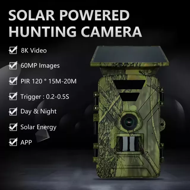 Step into the wild with confidence using the Wireless Solar WiFi Hunting Camera. Engineered for outdoor enthusiasts and hunters, this advanced trail camera delivers breathtaking clarity with photo resolutions up to 60MP and crystal-clear 8K video recording. With its ultra-fast trigger speed of just 0.2–0.5 seconds, you’ll never miss a moment of wildlife action, no matter how quick.